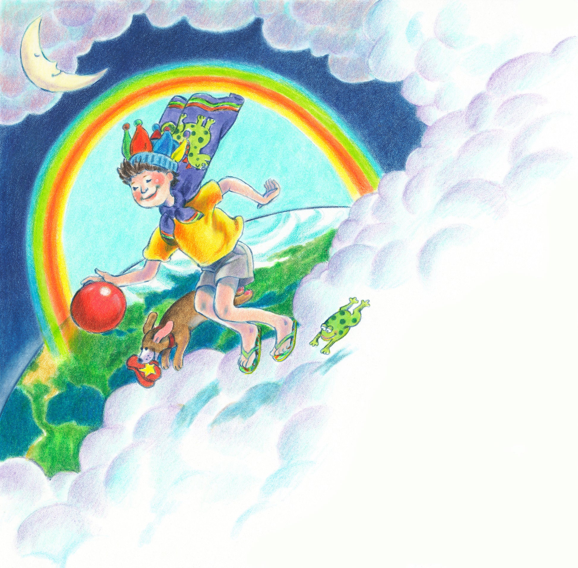 An original illustration from the children's book Where the Lost Things Go is the perfect addition for a nursery or child's bedroom. Each evocative and colorful illustration comprises a full-color, full-page illustration from the picture book, framed and ready to hang. Most include a small vignette, also framed and ready to hang. Please note: the following illustrations do not come with a vignette: Rainbow; Sleeping in Clouds; Play ball; and Play Ball 2.